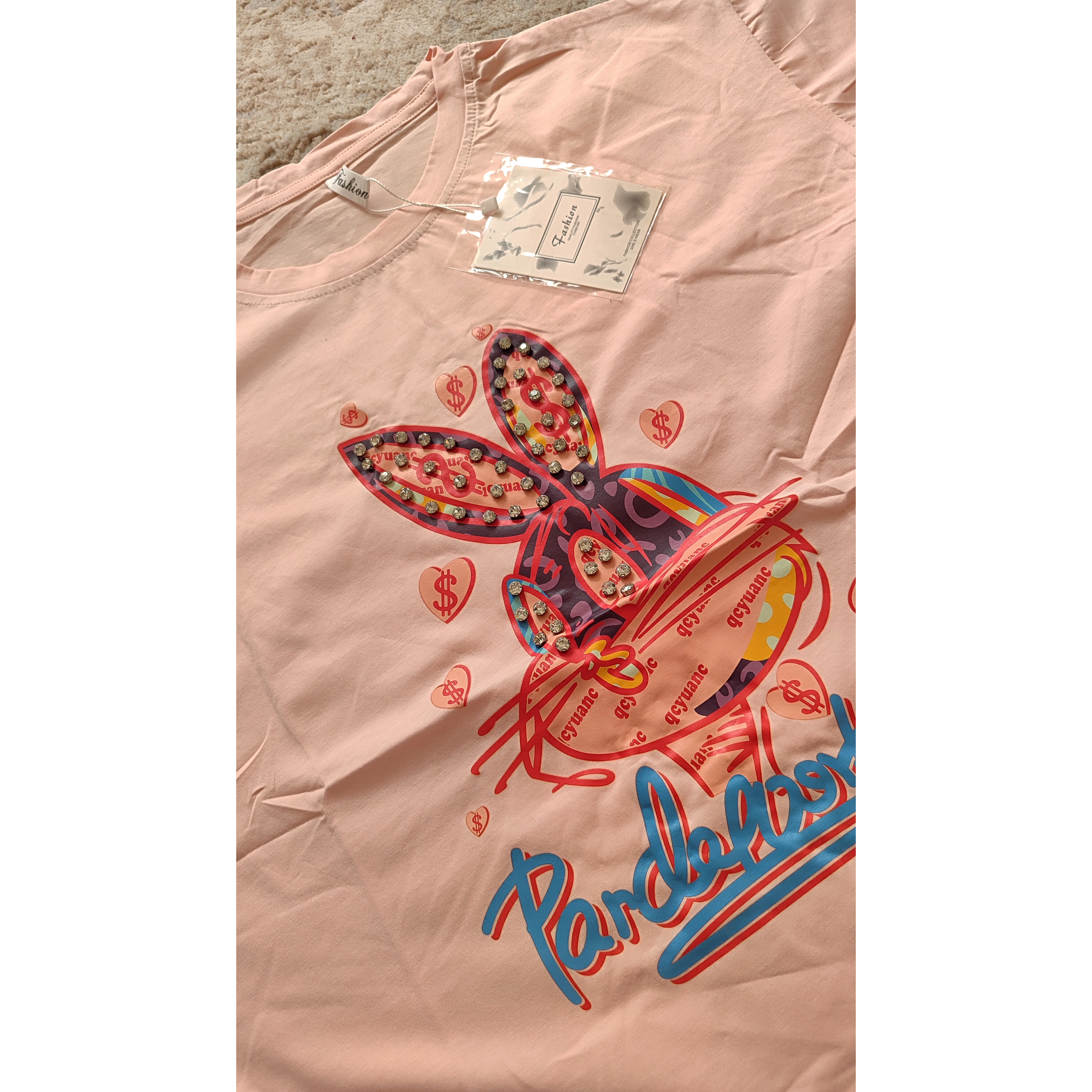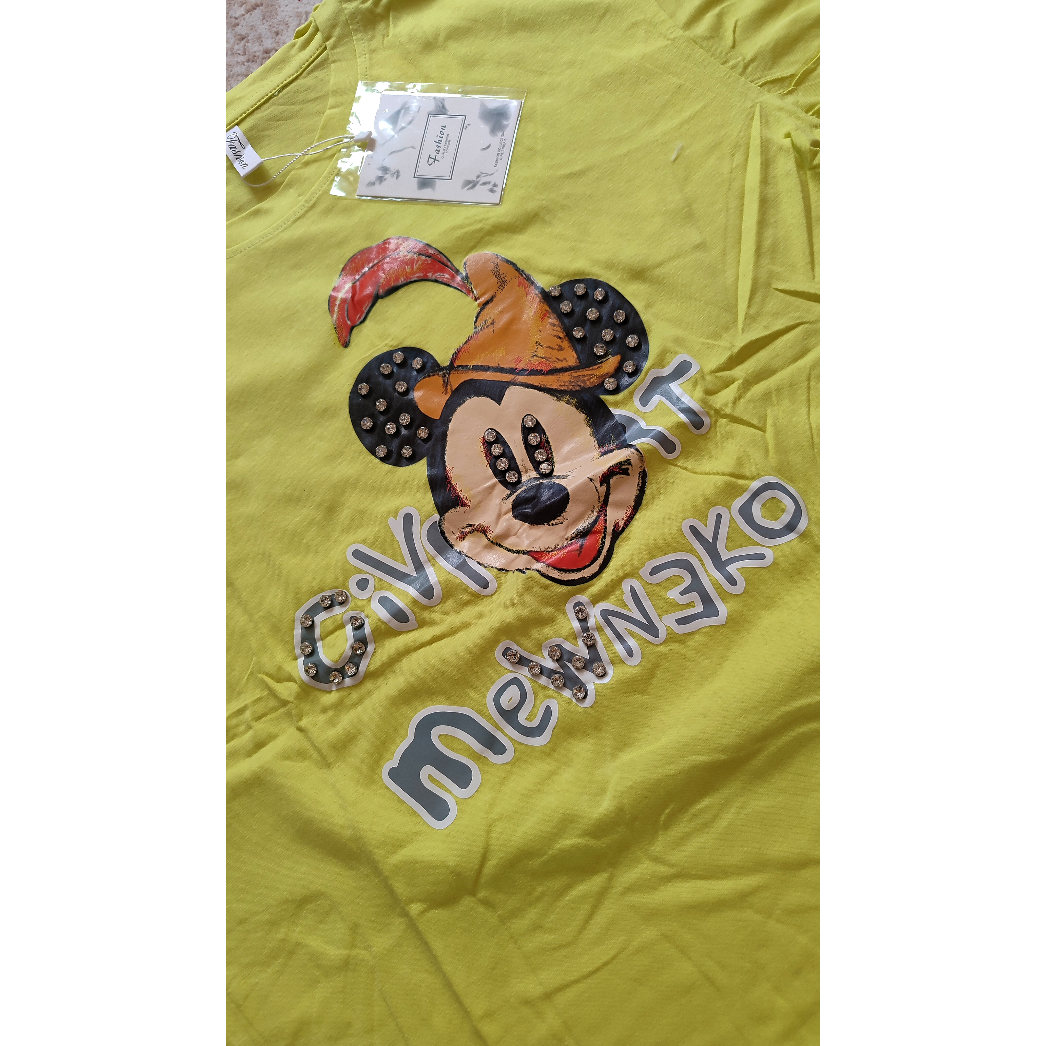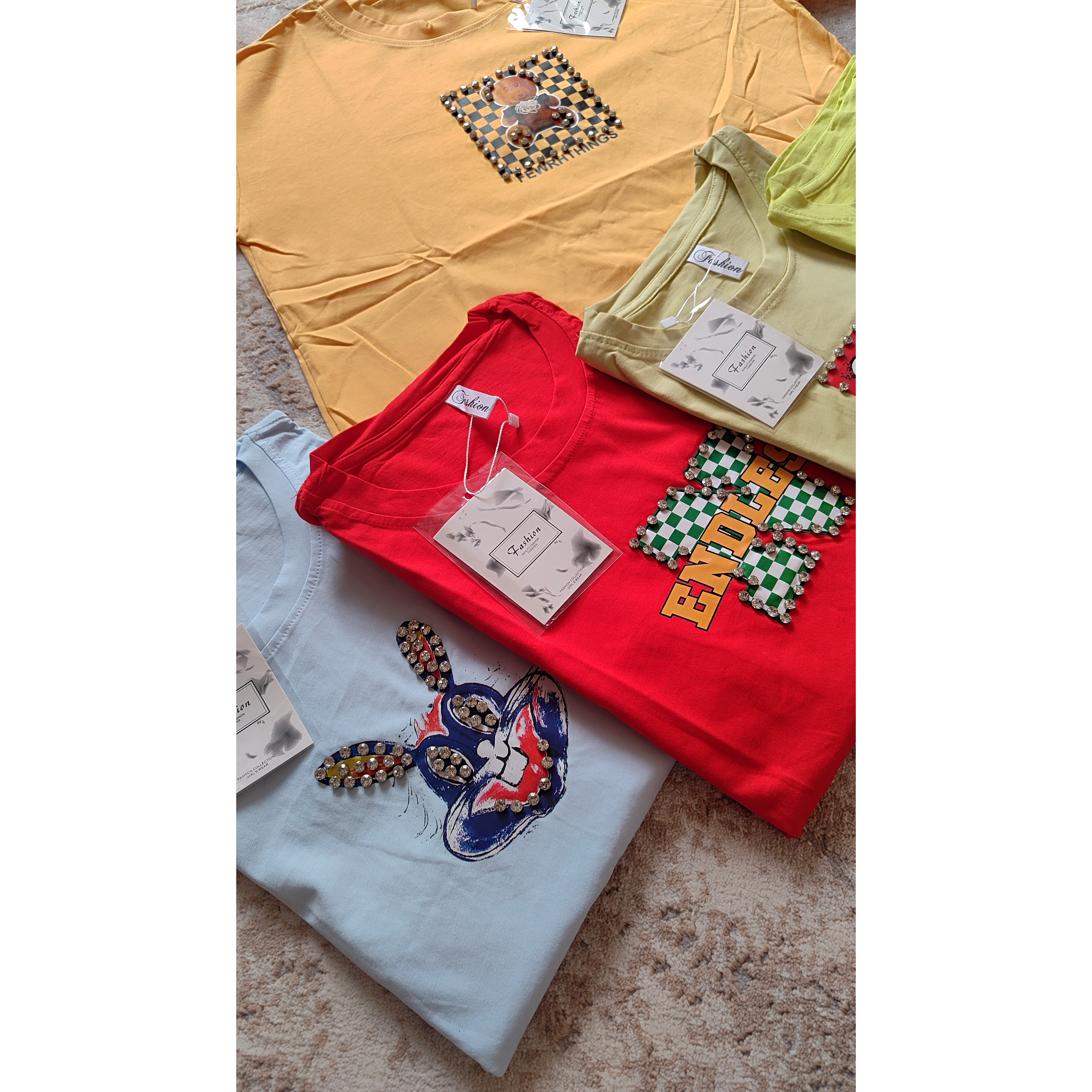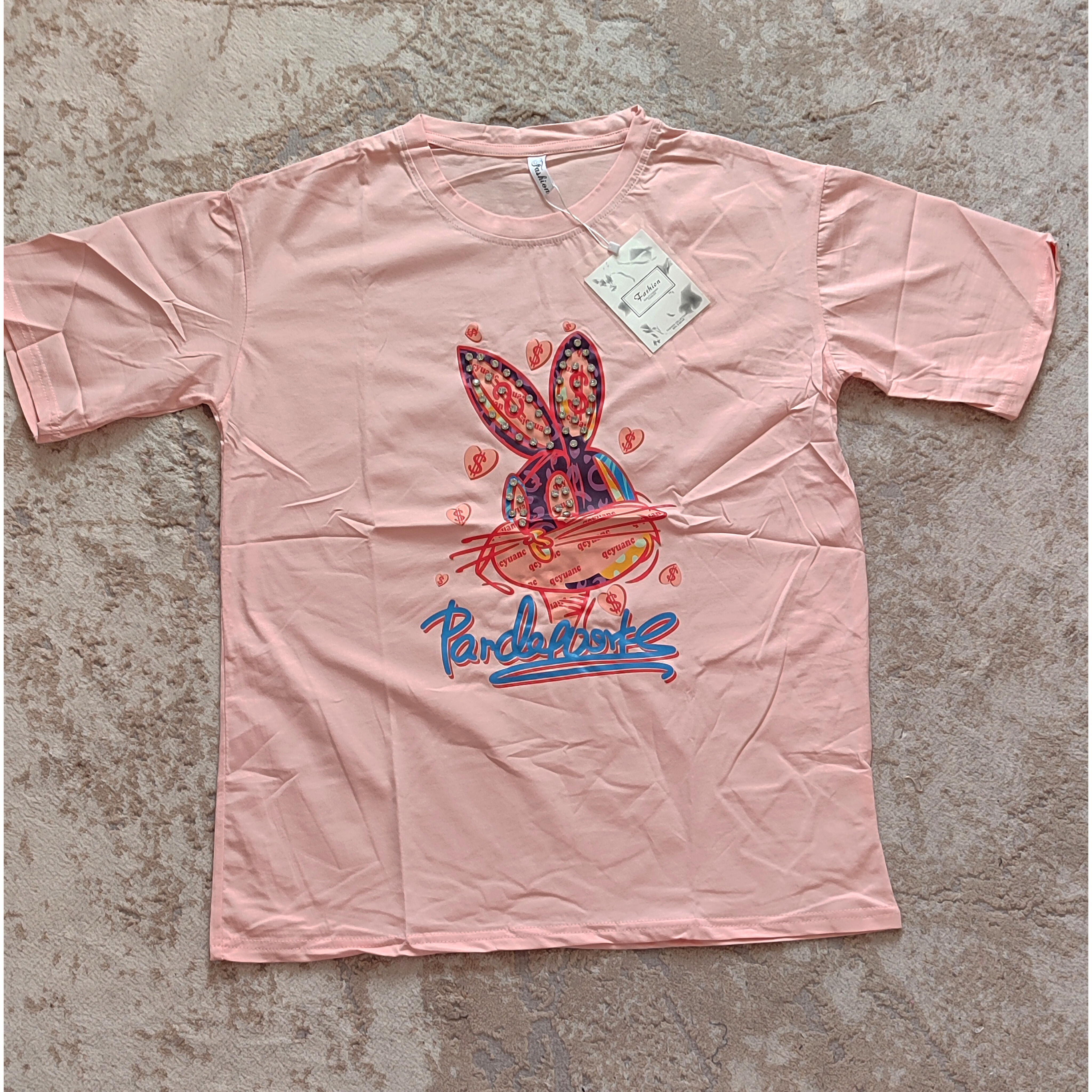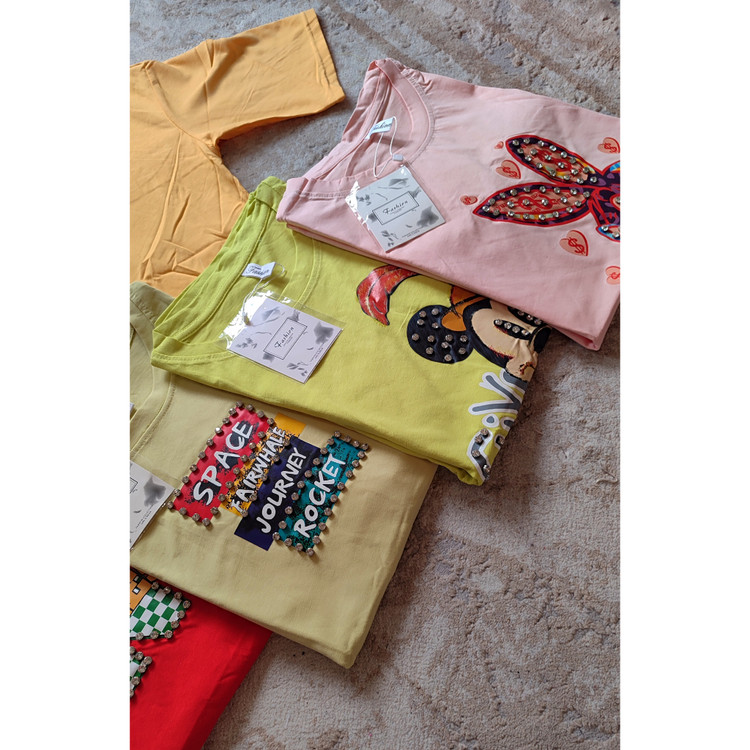 تیشرت لانگ وارداتی نخ پنبه اعلا با طرحهای کارتونی کیوت و رنگهای شاد (روی طرح جزئیات کریستالی دارد)